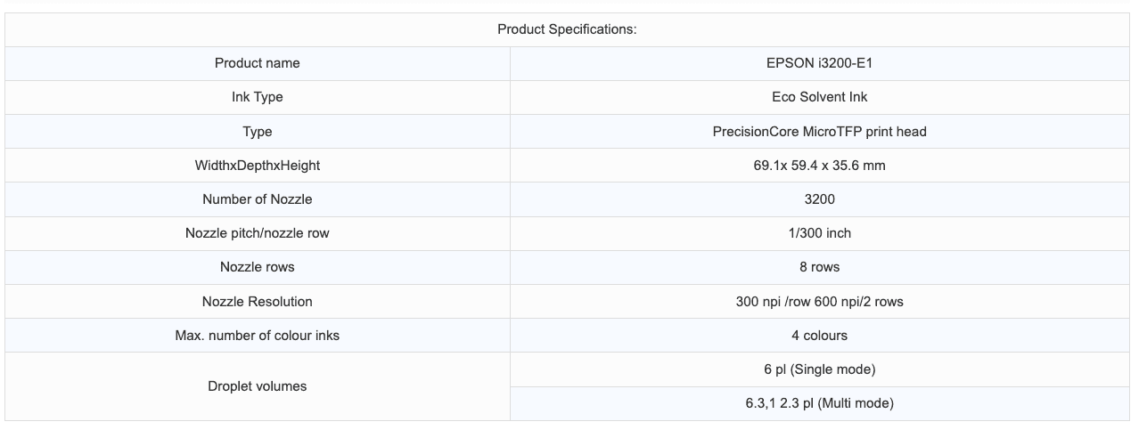 The Epson authorized i3200-E1 Water is a cost-effective 1.33inch-wide MEMs head series providing high productivity and high image quality with (600 dpi/colour) high-density resolution. This printhead is suitable for water based inks. Ink ejection of up to 4 colours realize with high resolution.PrecisionCore print head has proven high durability and extended service life by Epson's industrial printers.