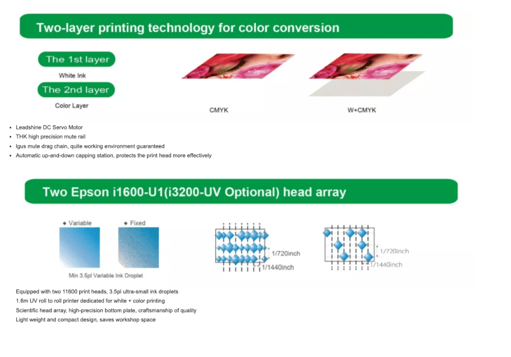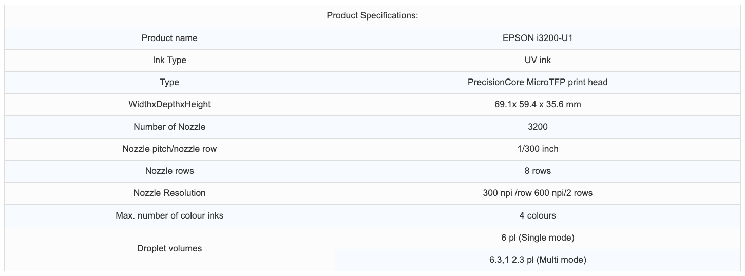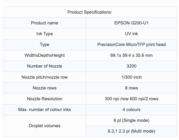 The Epson authorized i3200-U1 Water is a cost-effective 1.33inch-wide MEMs head series providing high productivity and high image quality with (600 dpi/colour) high-density resolution. This printhead is suitable for water based inks. Ink ejection of up to 4 colours realize with high resolution.PrecisionCore print head has proven high durability and extended service life by Epson's industrial printers.