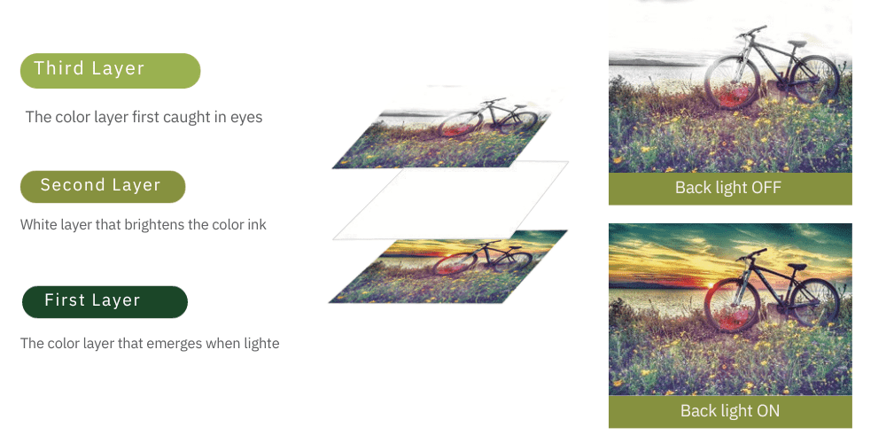3 layers printing to build layered transformative graphics for backlit application